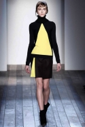 Традиционные короткие прямые платья и узкие пальто, которые дизайнер показывает из сезона в сезон, были бы повторением пройденного, если бы не графичная гамма — черный, бледно-желтый, синий, светло-коричневый, и умелое использование этих цветов, в духе тяготевшего к геометрическим формам авангардного искусства. Прием контрастности Бекхэм применила и в отделке воротников и манжет у блуз, а некоторые модели сложного кроя были умело скомбинированы из элементов из черного и темно-синего материала. Еще один неизменный конек Виктории — это стремление к высокому портновскому качеству коллекций.