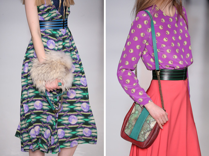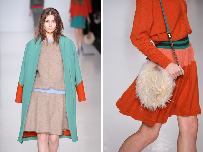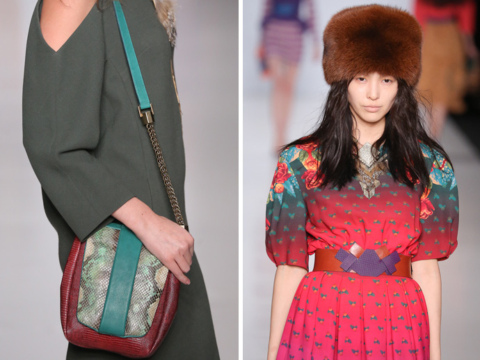 Образы дополнили объемные меховые и вязаные шапки, массивные колье, сумки и туфли из комбинированной кожи и меха.