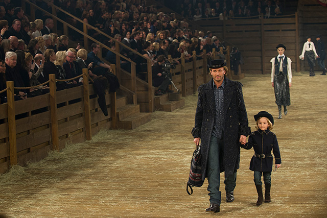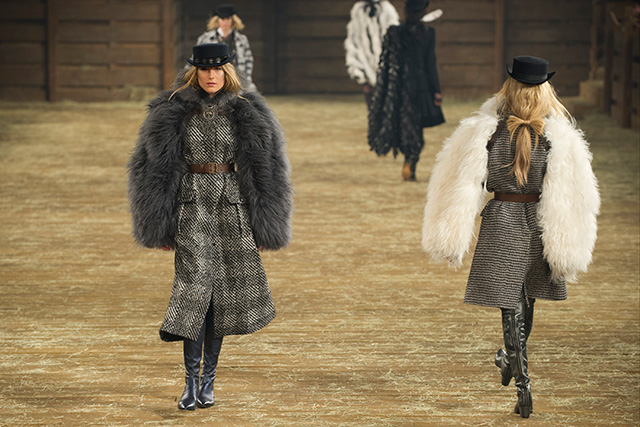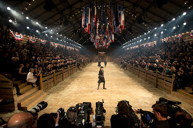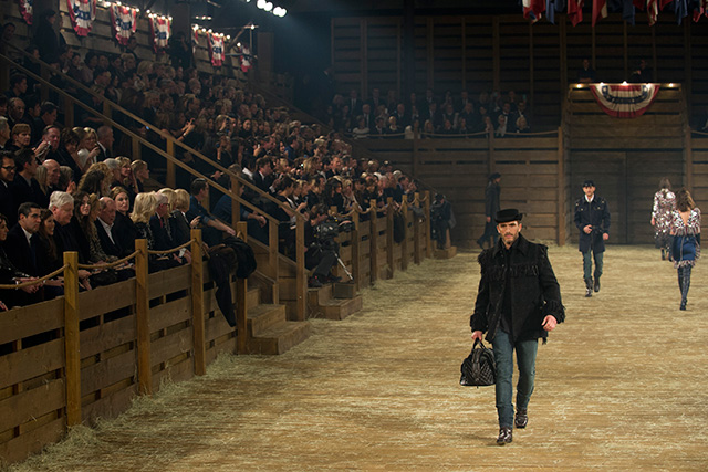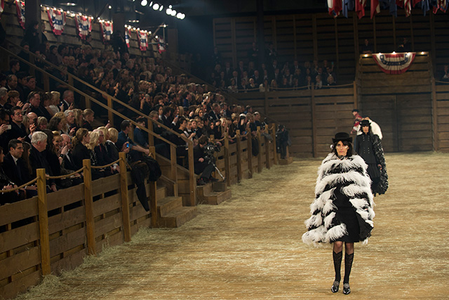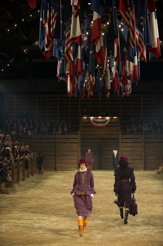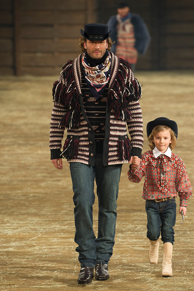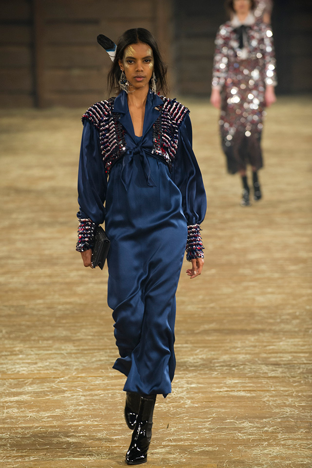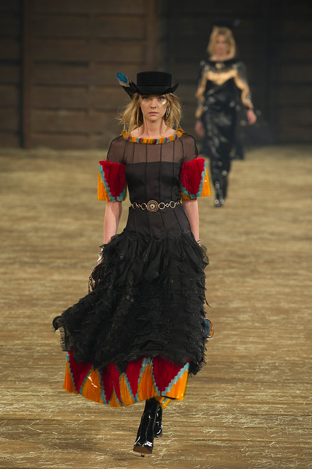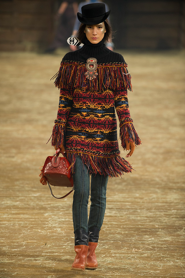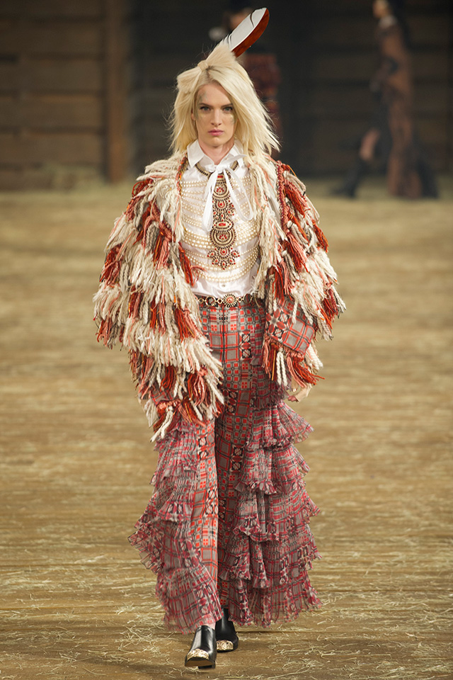 Классические вещи Chanel Лагерфельд легко адаптирует под американские образы: сапожки с твидовыми ретро-костюмами, связки жемчужных нитей, завязанные на шеях в небрежные крупные узлы, скрещенные пистолеты на поясах черных юбок, замотанные платками с логотипами Chanel лица и глаза, угрожающе блестящие из-под полей ковбойских шляп. Но главная роль, конечно, досталась индейцам — километры бахромы, которой обрастают даже классические стеганые сумки Chanel, национальные индейские узоры и вышивки, перья в волосах моделей, наряды настоящих Покахонтас, огромные пончо-одеяла. А из-под традиционного пончо выглядывает абсолютно современный костюм из черной жатой кожи, с лацканами и отворотами в золотых заклепках.