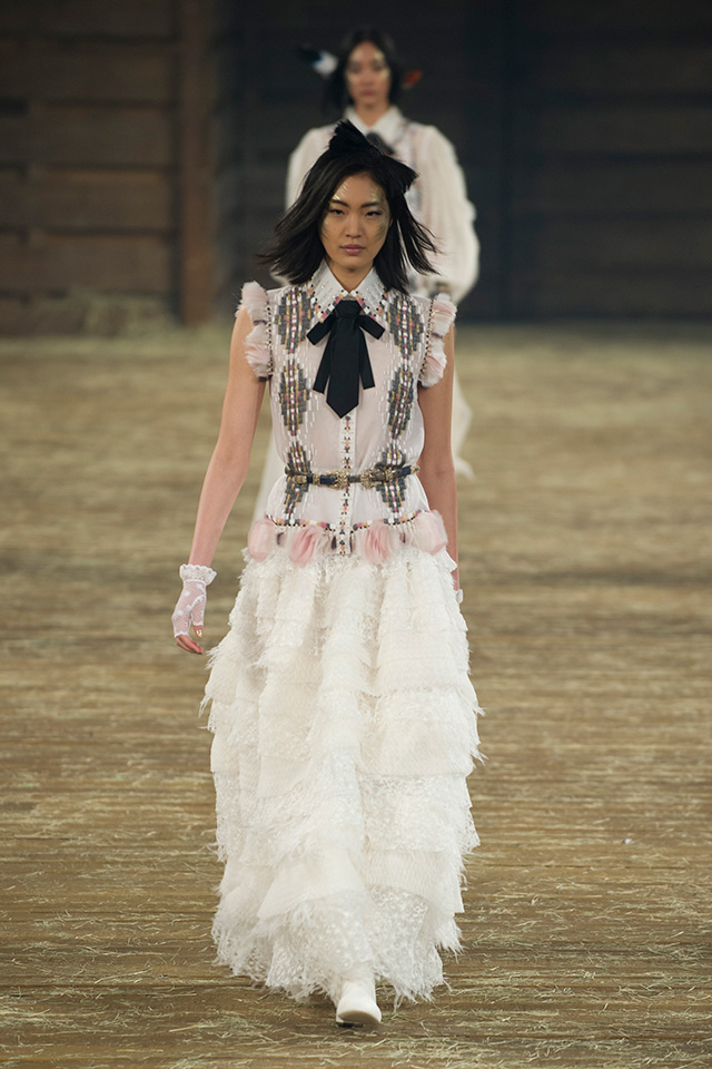 Закрывают показ два выхода с роучами, традиционными головными уборами индейских воинов из перьев. У последней модели перья не только на голове, но и на брюках вместо лампасов, и за спиной, как крылья — настоящий белый ангел Chanel.