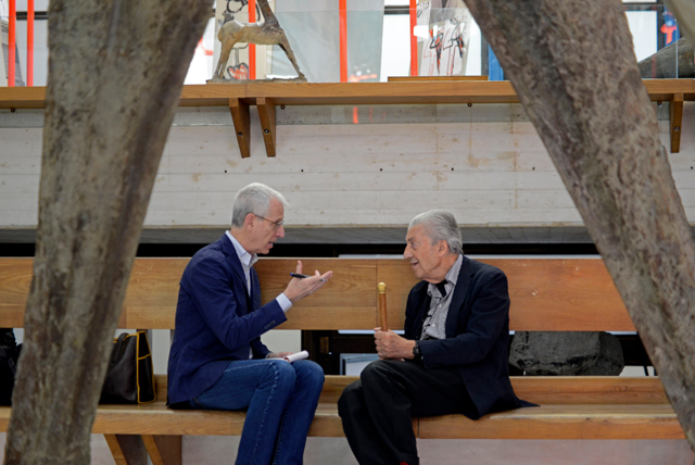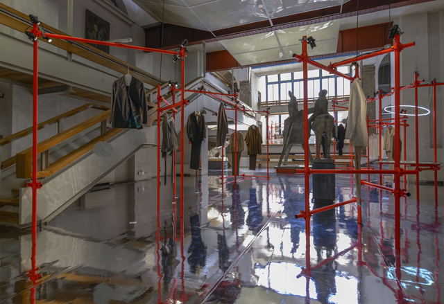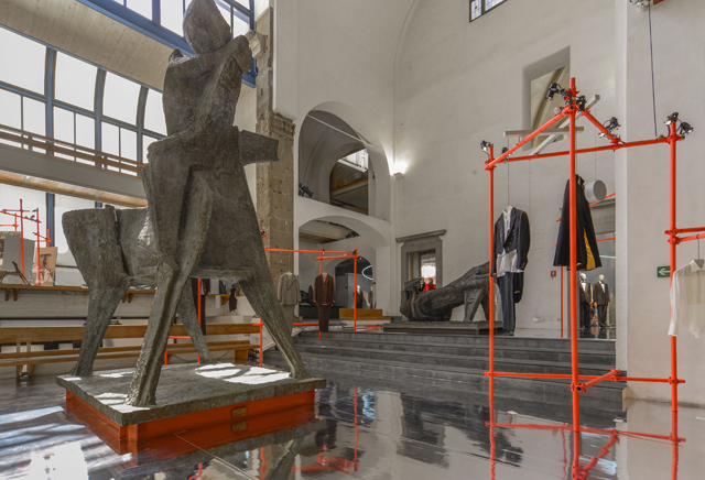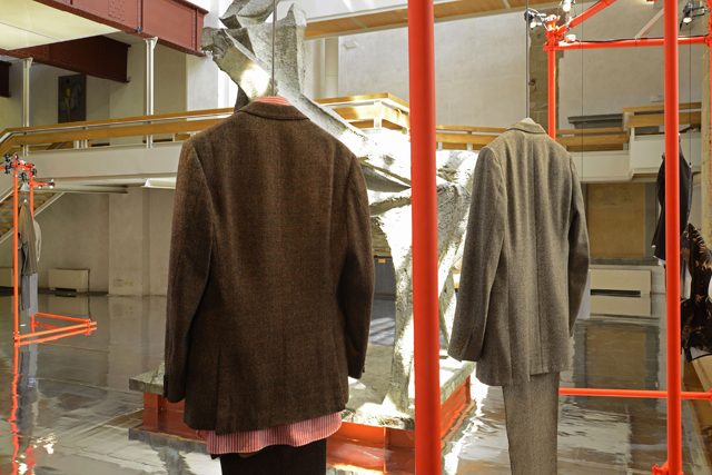 В главном зале Музея Марини, в самом его начале висит серый мужской пиджак, сильно траченный молью — буквально изъеденный, весь в дырках, и кажется, что если его хорошенько тряхнуть, он рассыплется в прах. В окружении модернистских скульптур Марино Марини с их резкими, рублеными линиями этот серый пиджак выглядит безусловным предметом искусства. Следом за ним видишь также подвешенный среди скульптур сумасшедший черный кожаный комбинезон, скроенный каким-то невероятным образом, — и вот он-то выглядит совсем уж инсталляцией. Дальше — справа коричневый плащ-накидка, слева — черный кейп с заботливо отвернутой полой, открывающей желтый шелк подклада. Вещи висят на красных металлических рамах, специально установленных среди мариниевских условных человечков на таких же условных конях и каких-то абстрактных каменных штуковин. Два этажа бывшей церкви Святого Панкратия, где теперь музей, заполнены личным гардеробом Нино Черрути, которому в этом году 85 лет и который лично вместе с одним из лучших фэшн-журналистов Анджело Флаккавенто подготовил эту выставку.