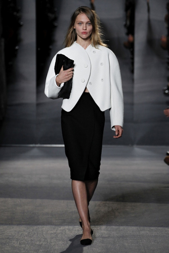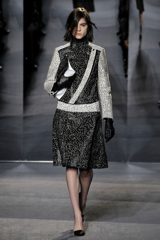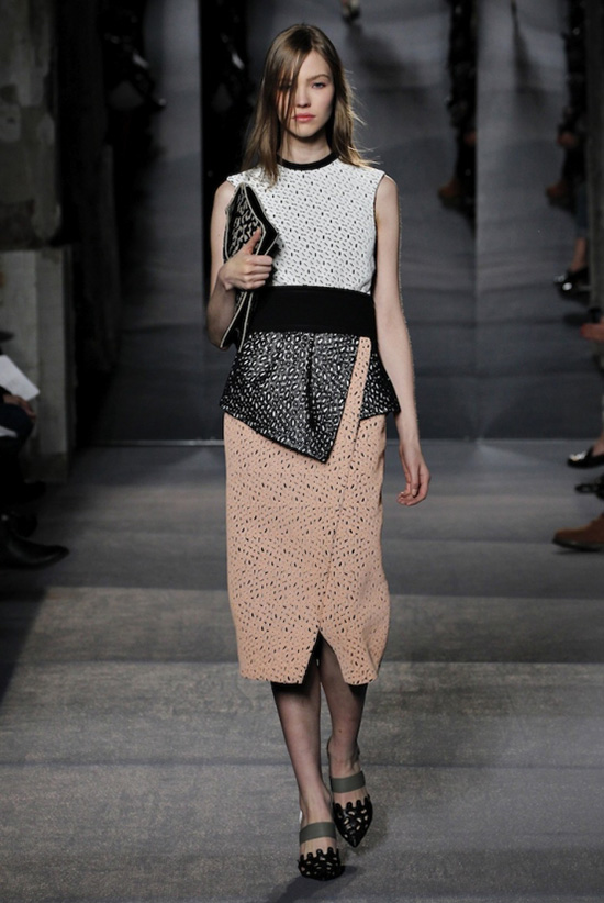 По-преимуществу черно-белая гамма со светло-серыми и нежно-персиковыми вкраплениями, укороченные жакеты и пальто с закругленными плечами в традиционном "баленсиаговском" ключе, узкие юбки чуть ниже колена с запахом и небольшим вырезом, коктейльные платья из гипюра. Нежная и мягкая "буклированная" ткань, из которой, как кажется, сшиты жакеты и юбки, на поверку оказывается разработанным дизайнерами специально для коллекции материалом из переплетенных кожаных "нитей". Ткань из плотной вышивки на самом деле произведена в ходе сложного процесса под не самым благозвучным названием. Кто там все еще предрекает смерть люкса? Люкс не умрет, просто он будет появляться, в том числе, в результате "ультразвуковой сварки". А собственно, почему нет?