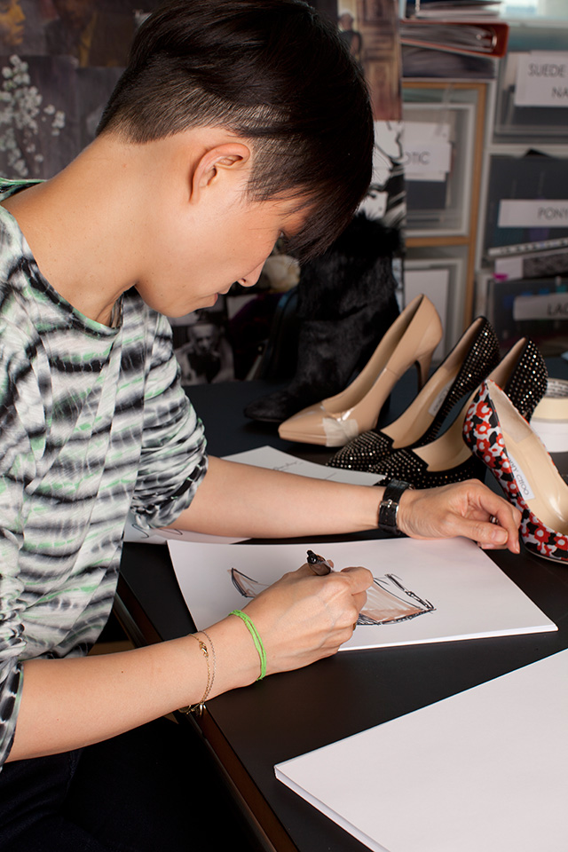 Мы решаем остановиться на переговорной с мудбордами и образцами новых коллекций. Попытки уговорить Сандру взять в руки одну из новых пар туфель сразу разбиваются о ее непоседливость и нелюбовь к позерству: "Мне кажется, я похожа на ведущую телемагазина!" Я предлагаю компромисс: "Хорошо, покажите мне, чем глава империи Jimmy Choo обычно занимается в этой комнате?" Она, как восторженный ребенок, хватается за бумагу и фломастеры и начинает рисовать эскизы туфель.