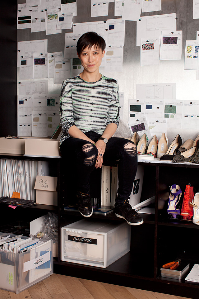 Головной офис Jimmy Choo в британской столице занимает сразу два этажа крупной высотки из стекла и металла. Прибыв заранее, мы с фотографом растерянно пытаемся выбрать площадку для фотосессии. Балконы, переговорные, ресепшен — все выглядит очень привлекательно в лучах яркого солнца, но на съемку у нас всего полчаса. "Вам страшно повезло, обычно на такой высоте по окнам офиса часто ползут капли дождя", — смеется Сандра Чой.