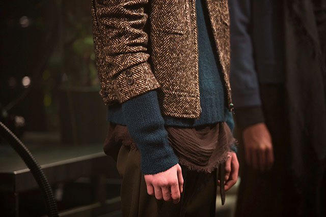 Надо сказать, что ждут тут не только японцев. Корейцы — и корейские байеры, и корейские марки, и корейские дизайнеры — это новые японцы, их все жаждут, ими все чрезвычайно увлечены. Показ корейской марки Juun.J был не только лучшим шоу Pitti Uomo, но вообще одним из лучших в сезоне. Огромные высокотехнологичные вещи и обувь из кожи нежнейшего телесного оттенка, большущие черные кожаные куртки на белом меху, как из кино о постиндустриальном будущем — Джун Джи говорит, что он использовал эстетику аниме. А еще гротескного вида классические жилеты, сюртуки, спенсеры и прочий tailoring — со свисающими до колен рукавами и путающимися вокруг ног полами. «Для меня это и есть взаимодействие с западной эстетикой, — говорит мне после шоу Джун Джи, — не копирование, а работа с контрастами». Забавно, что буквально через неделю Раф Симонс показал коллекцию ровно такого же гипертрофированного оверсайза с болтающимися рукавами, только там, где отточенный корейский взгляд препарирует историю европейского костюма, отдохнувший Симонс радостно отряхает с ног своих прах гламура и увлеченно играет с эстетикой клошаров.