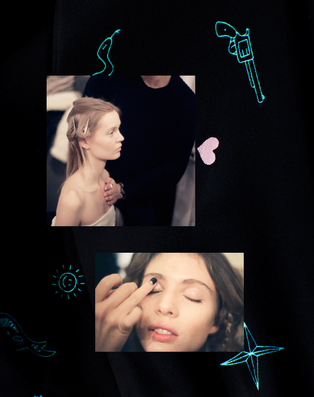 Некоторое время спустя за кулисами показа достают из синих коробок кеды и сандалии adidas x Opening Ceremony, красят моделей блестящими тенями и наклеивают им на икры, плечи и животы переводные татуировки. Они, кстати, будут и на самой одежде — принтами в виде тату в новой коллекции Walk of Shame покрыты комбинезоны, рубашки и платья. Их сделали по эскизам художника из Ялты, который срисовал татуировки с тел реально существующих людей — девочку с запястья Насти Рябцовой, придуманный Скоттом Кэмпбеллом цветок с плеча Кортни Лав, пистолеты с рук Фреи Бехи Эриксен и многое другое.