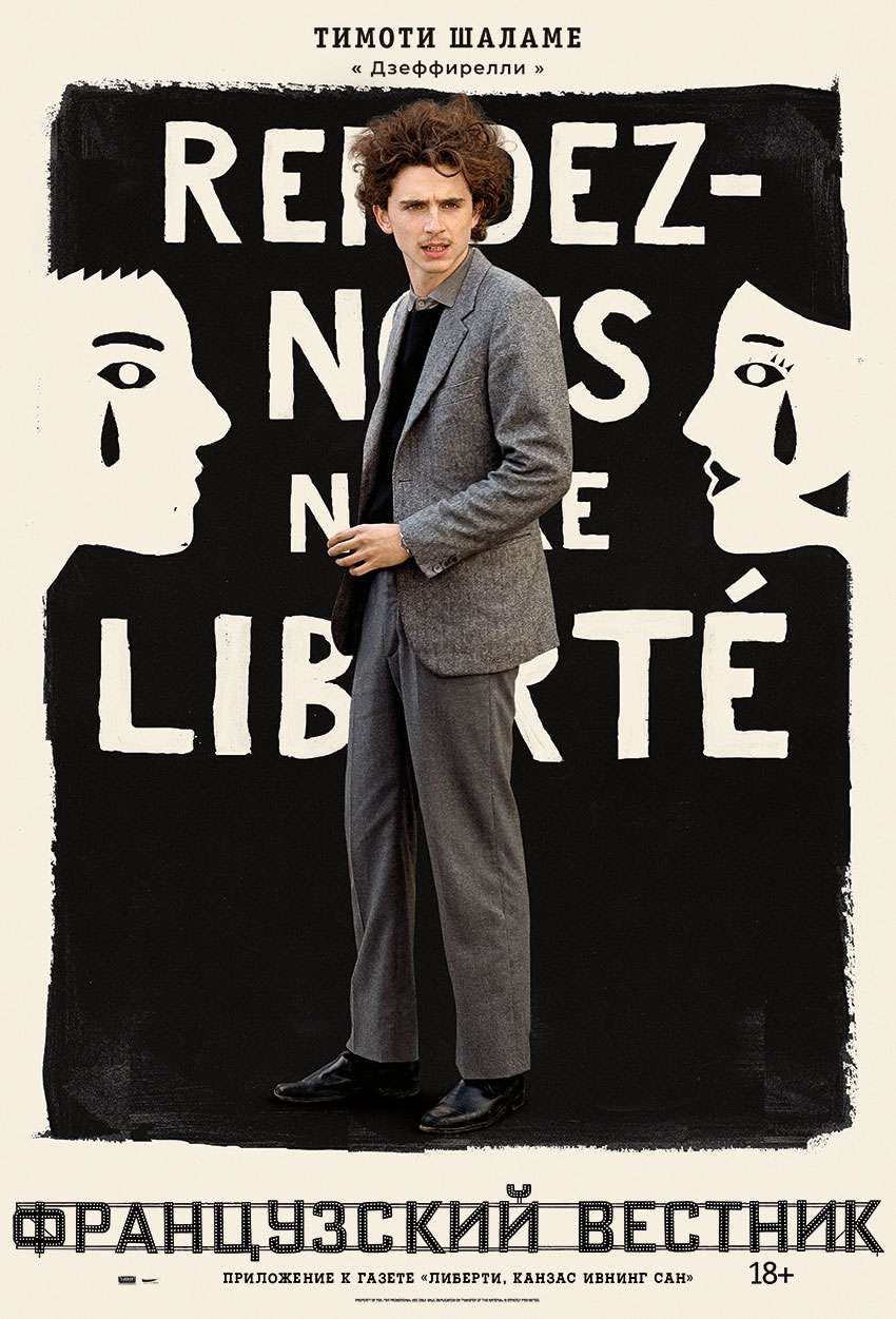 Одной из центральных фигур второго сюжета фильма оказывается журналистка и автор статей о студенческих протестах Люсинда Кременц (Фрэнсис Макдорманд). Соблюдать профессиональный нейтралитет Кременц обещает самой себе и главным участникам событий в ярком красном костюме с юбкой и лоферах. А еще — с вместительной сумкой и сигаретой в руках. Заданная цветом тема революции и стремления к общественным переменам поддерживается растрепанным волосами главного бунтаря Дзеффирелли (Тимоти Шаламе). В отличие от своей будущей возлюбленной Джульетты (Лина Кудри), которая в кадре появляется в юбке в клетку и кожаной куртке и не расстается с мотоциклетным шлемом, он носит «профессорский» шерстяной пиджак в елочку и рубашку под свитер.