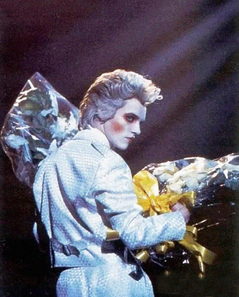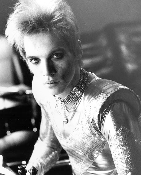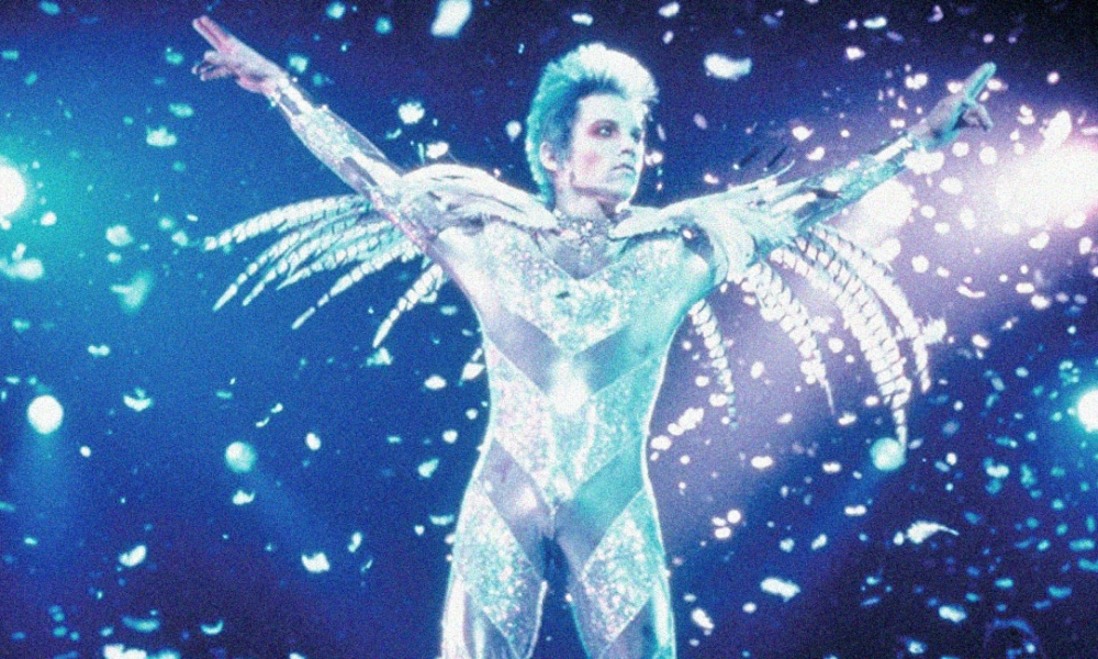 Серебряный виниловый комбинезон со вставками из искрящегося глиттера. Воротник из белоснежных перьев, который по масштабу сравним разве что с одеяниями монархов с картин времен XVIII века. Чокер-колье, целиком и полностью выполненное из кристаллов. Закатив глаза во всем этом великолепии, звезда глэм-рока ожидает своей смерти от пули неизвестного — пускай и инсценированной. Образ рок-звезды и гей-иконы 70-х годов Брайана Слейда будто под копирку списан с Дэвида Боуи, за что Тодд Хейнс и команада, которая занималась продакшеном фильма «Бархатная золотая жила» (оригинальное название «Velvet Goldmine» — еще одна отсылка к Боуи, а именно к названию его песни), выслушали немало угроз довести дело до суда от самого Боуи. Тем не менее создатели фильма, настаивают, что герой стал собирательным образом из как минимум трех звезд эпохи — Боуи, Брюса Вейна Кэмпбелла и Марка Болана.