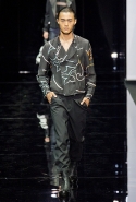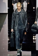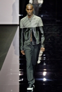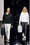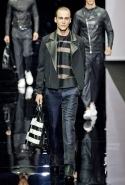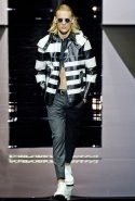 Крупная оптическая клетка, черная на белом и белая на черном, полоски разной ширины во всех возможных сочетаниях — геометрия и привычная монохромная графика в коллекции Emporio Armani оживают прямо на его моделях. Расстегнутая снизу до самой груди молния на куртке разводит полосы, превращая их в разомкнутые круги, простые прямые путаются, переплетаются и распадаются на кусочки. Похожее происходит, например, с ложкой, опущенной в стакан воды, которую граница между водой и воздухом в наших глазах "разрезает" на несколько частей.