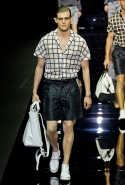 От резких переходов начинает рябить в глазах, но их Джорджо Армани уравновешивает крупными блоками черного и темно-синего без примесей, на которых глаз буквально отдыхает. Но уже через десяток-другой выходов (а это, учитывая размах, с которым команда Emporio Armani подошла к выпуску коллекции, совсем немного — шутка ли, 90 выходов!) клетка возвращается в сочетании с новым повторяющимся принтом, только еще мельче, а полоски становятся тоньше и чаще.