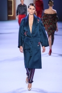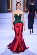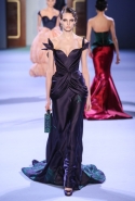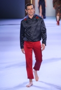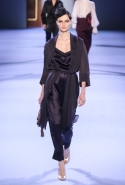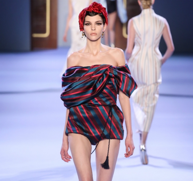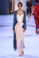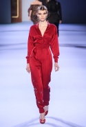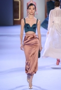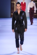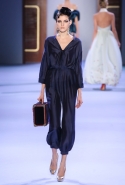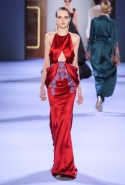 Дизайнер не раз рассказывала, что родилась в городе Усть-Каменогорске в восточном Казахстане, и страна из ее коллекции — страна полумифическая и полусказочная, по кусочкам собранная из детских воспоминаний о трех разных советских республиках, Туркменистане, Узбекистане и, конечно, Казахстане. Советское хлопковое прошлое встречается с древней культурой стран и знакомыми всем кодами. Просторные струящиеся шелковые комбинезоны и халаты, пояски-веревки с золотыми кисточками на концах, яркая полоска с национальных костюмов — из этой ткани сшиты не только шаровары, по-султански выглядывающие из-под распахнутой спереди юбки, но и изящное платье, открывающее взгляду белый стеганый корсет. Оголенные плечи, спущенные с них мягко закрученные складки ткани, будто медленно стекающие по телу, тяжелый блеск насыщенного темного шелка и золотой бахромы, приталенные длинные жакеты расшиты национальными вышивками, а на головах девушек — тюрбаны и малышки-шляпки, напоминающие и тюбитейки, и мятные конфеты.