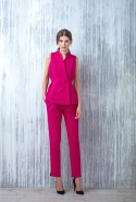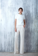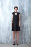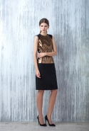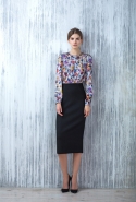 Предосенняя коллекция получилась не такой жизнерадостной и воздушной, а скорее сдержанной и спокойной. Здесь в основном разнообразные платья, — от мини до платьев в пол, от "халатов" до "футляров" — брючные костюмы, пушистые мохеровые кофточки, свитшоты с юбками. Основной цвет — черный, но есть и синий с фуксией, и позолоченные вставки, и принты с цветами и бабочками, совсем как на платьях советских девушек.