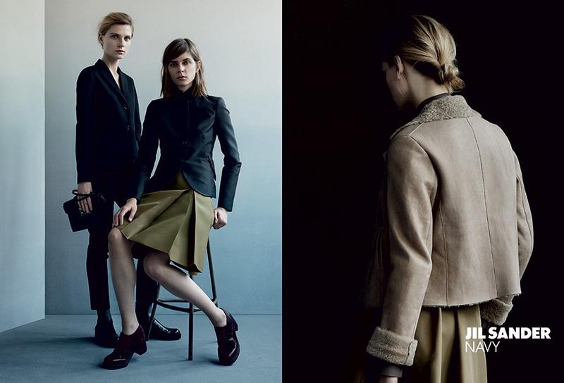 Реклама осенне-зимней коллекции Jil Sander Navy — демократичной линии Jil Sander — получилась темной, холодной, едва ли не удручающей. Джулия Гетта сняла Кел Марки и Марию Локс в строгих пиджаках и глухих черных юбках, мужских костюмах и андрогинных ботинках, рубашках, застегнутых на все пуговицы, и толстых дубленках.