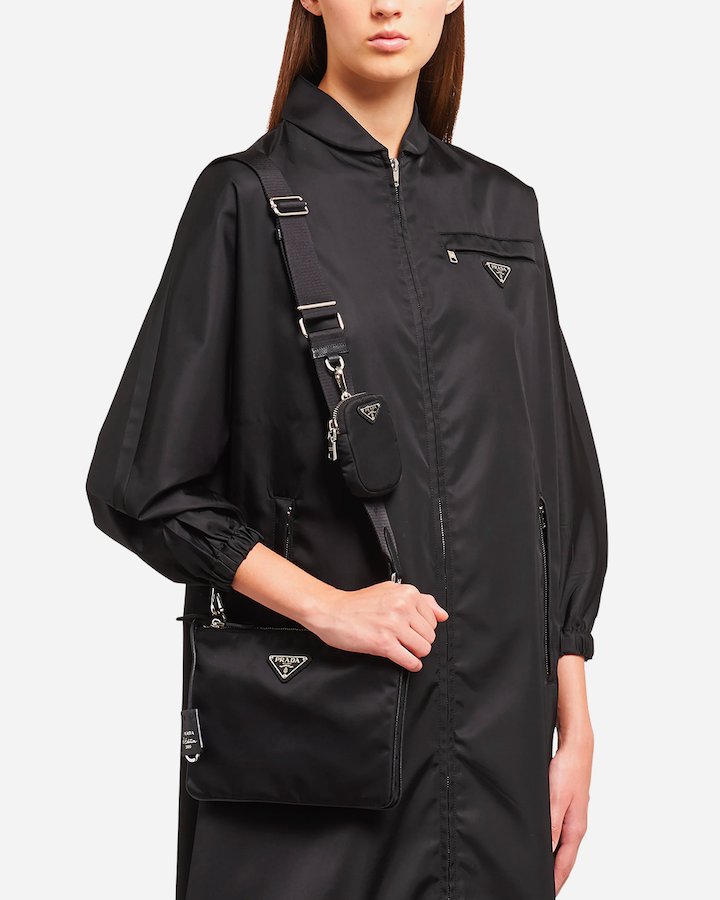 В линейке Prada Re-Edition перевыпущено несколько архивных моделей. В данном образе нейлоновая сумка прекрасно дополняет стеганую куртку с расклешенными рукавами, актуальные в этом сезоне джинсы полной длины и ботинки на тракторной подошве. Комплект завершают акцентные кольца, которые поддерживают фурнитуру на сумке.