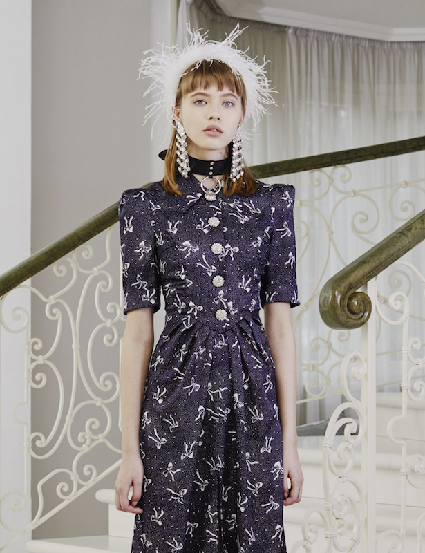 Тот случай, когда, несмотря на торжественный повод, можно обойтись без украшений, потому что каждый элемент в образе — уже акцент. Принт и блестящие пуговицы платья, интенсивный цвет клатча и крупные кристаллы с бантом на туфлях насыщают этот комплект деталями, которые интересно рассматривать.