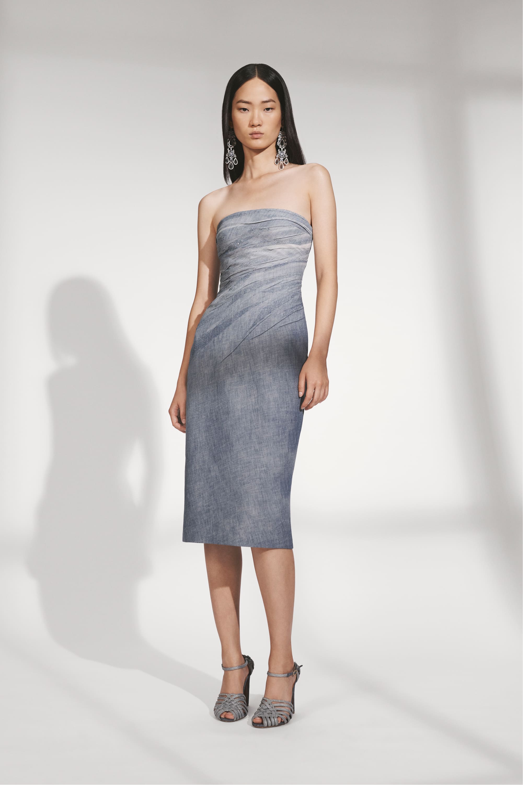 Платье Milez демонстрирует мастерство мистера Лорена в преобразовании традиционных тканей рабочей одежды в уникальные предметы гардероба. Силуэт коктейльного платья выполнен из хлопчатобумажного шамбре — легкой хлопковой ткани полотняного плетения, появившейся в XVI веке в коммуне Камбре (отсюда и название) на севере Франции. Изначально материал делали из льна, однако к началу XIX столетия основным сырьем для производства шамбре стал хлопок. Главные характеристики этой ткани — плотность в сочетании с легкостью. Именно поэтому шамбре стали использовать для производства униформы рабочих в США. Кстати, синий цвет этих рубашек породил название рабочего класса — «голубые воротнички». Более того, рубашки из шамбре даже были частью униформы американских моряков в начале XX века. Для создания этого платья ткань была тщательно «вымыта» для достижения выцветшего вида. Плиссировка спускается с левой стороны вниз к правому бедру, подчеркивая линию талии, а лиф платья украшен кристаллами. Такая же стираная хлопчатобумажная ткань шамбре используется в платье Fernanda. На его юбке присутствуют вставки из тюля, придающие платью легкость, а перекрещивающиеся на спине бретельки украшены микрокристаллами.
