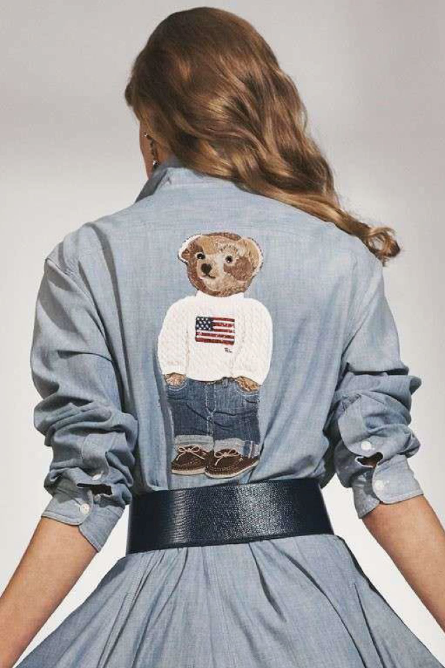 Культовое платье-рубашка Ralph Lauren в этом сезоне сшито из выстиранной хлопчатобумажной ткани шамбре и выполнено длиной до пола, а уникальность ему придает вышивка с медвежонком Polo Bear, одетым в классический свитер с американским флагом. Платье дополнено нагрудными карманами в традиционном стиле рабочей рубашки. Использование техники «трапунто» делает юбку еще более изысканной. Трапунто (Trapunto) в переводе с итальянского означает «вышивка», а на латыни — «укол иголкой». Отличительной чертой изделий, выполненных в этой технике, является объем. Традиционно Трапунто выполняется вручную, либо на швейной машине, в свободно-ходовой технике.