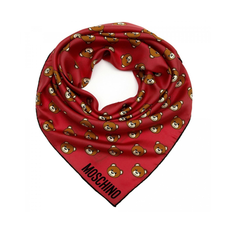 Красный платок Moschino с принтом в виде мультяшных мишек станет удачным дополнением к ироничному образу или ярким акцентом в сдержанном и минималистичном луке.