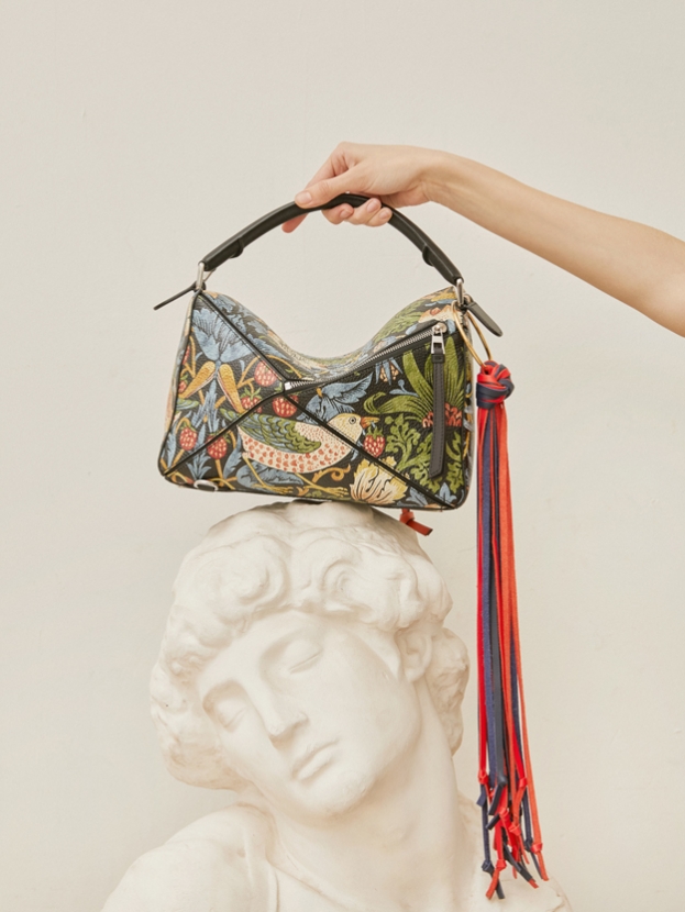 Яркие сложные принты появились на подиумах сезона весна-лето 2018 и так пришлись по вкусу байерам и покупателям, что дизайнеры продолжили эту тему и в осенних коллекциях, которые мы увидим в магазинах ближе к сентябрю. Главное, чтобы принты рассказывали историю и передавали атмосферу, а не только украшали вещи. Хороший образец модного аксессуара со сложным принтом можно найти в коллекции Loewe. Вместительная кожаная сумка с изображением птички в лесных растениях на черном фоне из линейки Puzzle станет незаменимым спутником не только на весну, но и на несколько сезонов вперед. Принт даже напоминает немного иллюстрации к русским народным сказкам, а благодаря натуральным оттенкам не надоест спустя три месяца. Сумку можно приобрести в магазине Aizel.