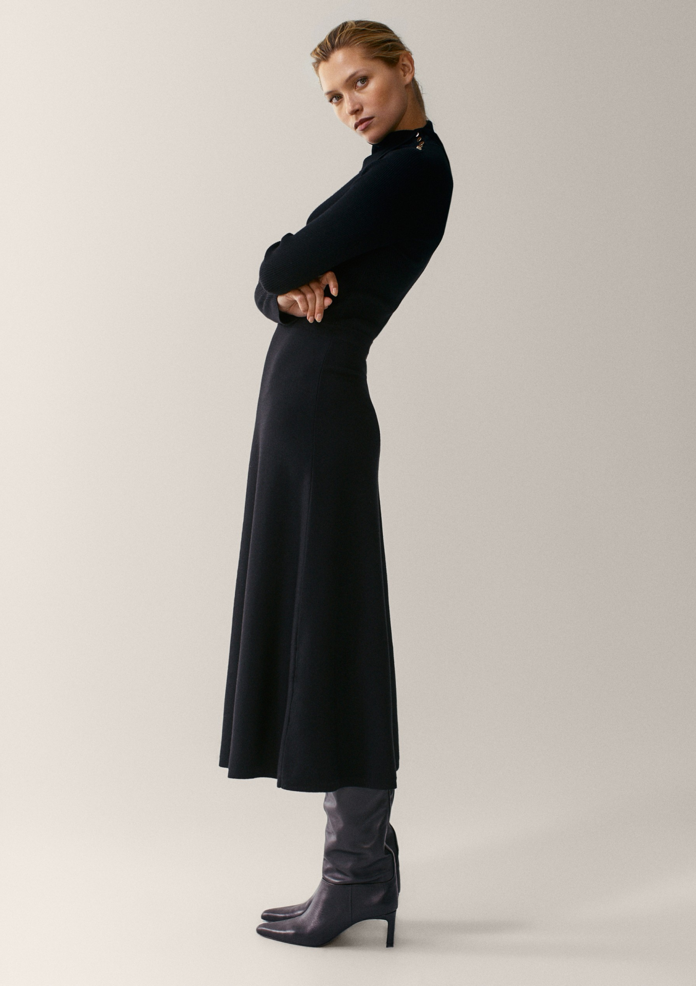Сапоги с острыми носами на небольшом каблуке дополняют юбку асимметричного кроя и объемное пальто из шерсти. Свитер бордового цвета и коричневая сумка разбавляют обилие черного, а украшения из позолоты и керамики добавляют последние штрихи.