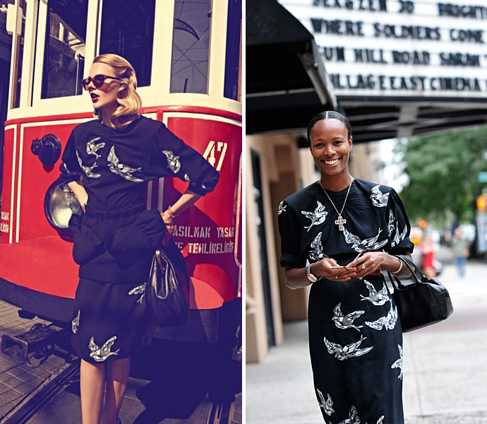 Бесспорно, самая красивая коллекция осени-зимы 2011 была показана в последний день теперь кажущейся такой далекой мартовской недели моды в Париже. Скромный, немного грубоватый стиль военных 40-х с их жесткими пальтовыми тканями, юбками, чуть прикрывающими колено, объемными плечами, гипертрофированными бантами и практичными съемными воротничками — Миучча Прада в очередной раз ошарашила гостей показа Miu Miu своей смелостью и бескомпромиссностью. Никому и никогда не удавалось сделать моду 40-х такой трогательной, нежной и женственной. На первый взгляд казавшиеся совершенно неприемлемыми в реальной жизни, пропорции осенней коллекции Miu Miu довольно быстро перестали всех смущать. Стоило только расшитым птичками и цветочками из пайеток, принтованым ландышами платьям с гипертрофированными плечами появиться в магазинах, они тут же перекочевали в гардеробы модниц, равно как и усыпанные блестками туфли и ботильоны на толстом изогнутом каблуке. То же самое касается и пальто: огромные плечи и банты на бедрах никого уже не пугают лишним визуальным объемом, а заставляют трепетать от одного только вида грубого драпа и крупных пуговиц.