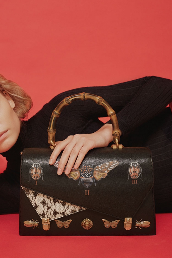 В последнее время сумки Gucci стали, кажется, главным объектом желания в мире аксессуаров. Из широкого ассортимента сумок в осенне-зимней коллекции бренда мы выбрали модель Ottilia. Сумка выполнена из кожи, а в качестве принта на нее нанесены изображения насекомых: жуков, божьих коровок, мотыльков и бабочек. Все рисунки выполнены в старинном стиле — в таком, который можно увидеть в книгах по биологии, расположившихся на пыльных полках антикварного магазина во Флоренции. Ручка сумки выполнена из бамбука, что лишний раз подчеркивает стремление модного дома погрузиться в романтическую старину.