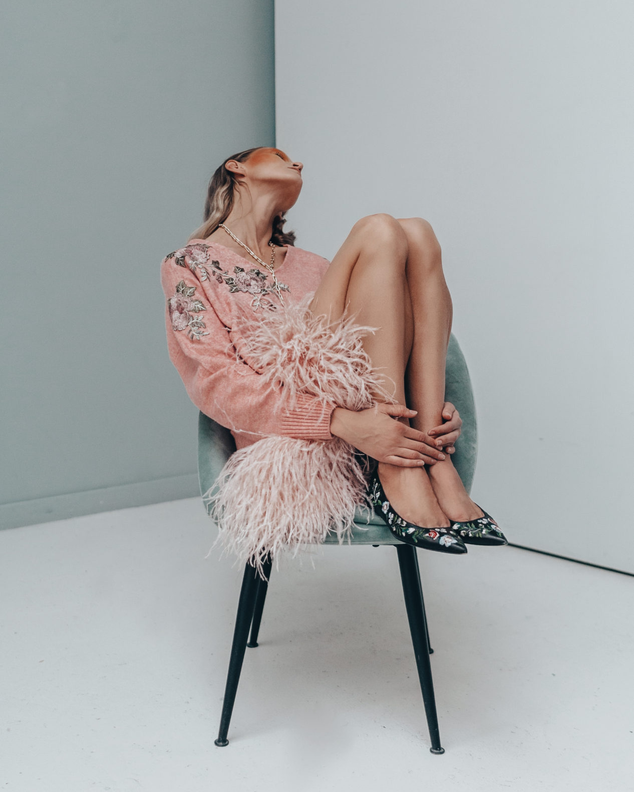 Однотонная юбка и спокойная по форме сумка — прекрасный фон для акцентных вещей: объемного свитера с перьями и мерцающих туфель.