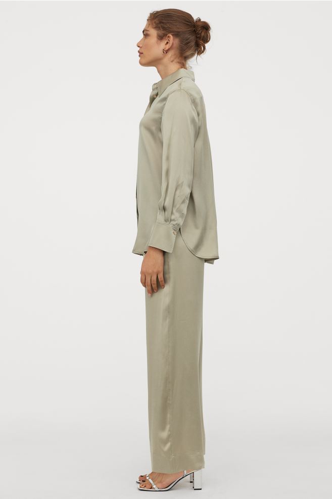 Шелковые брюки и рубашка, дополненные босоножками на высоких каблуках, выглядят роскошно и празднично. Рубашку можно носить вторым слоем, завязывая узлом, — такой вариант подойдет тем, кто любит делать акцент на талии. Завершают образ массивные серьги с полудрагоценными камнями.