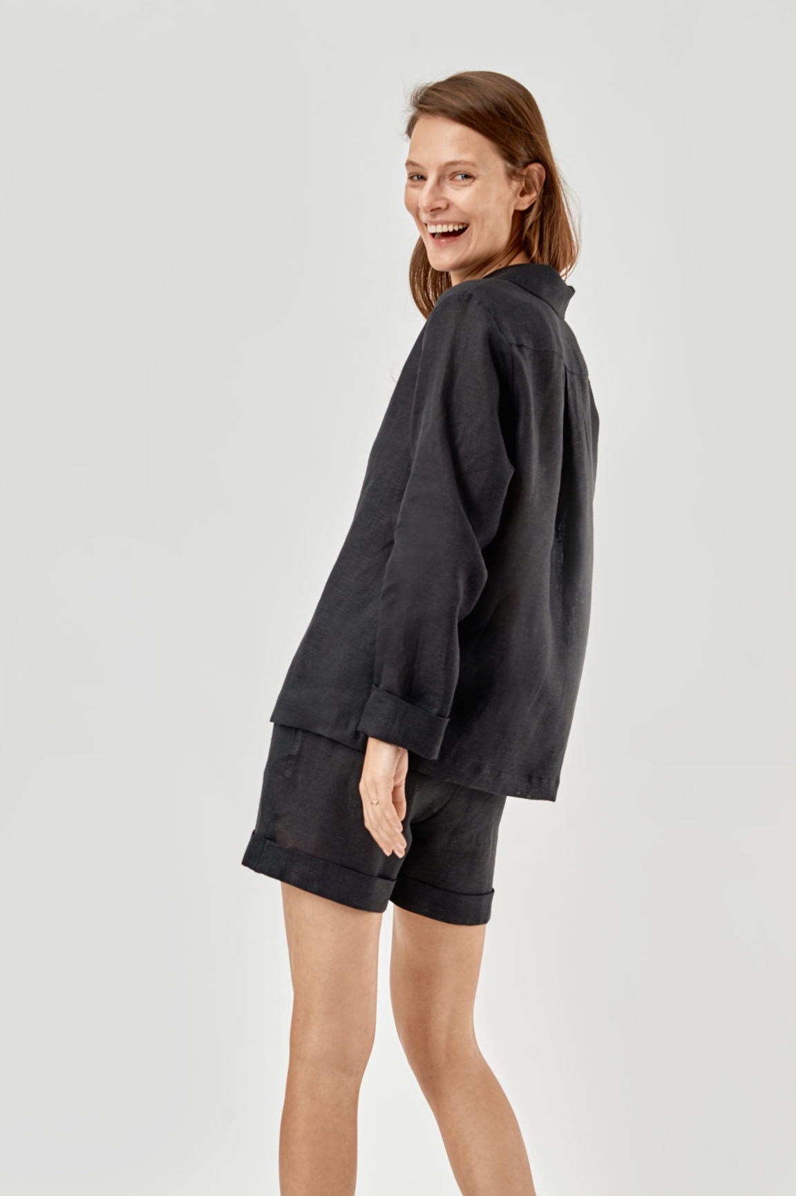 Рубашку и шорты из черного льна можно стилизовать разными способами. К такому комплекту отлично подойдут и кожаные сандалии, и белые кеды. Замшевые мюли винного цвета и сумка-ведро с кристаллами делают образ более нарядным и ярким — то, что нужно для окончания карантина.