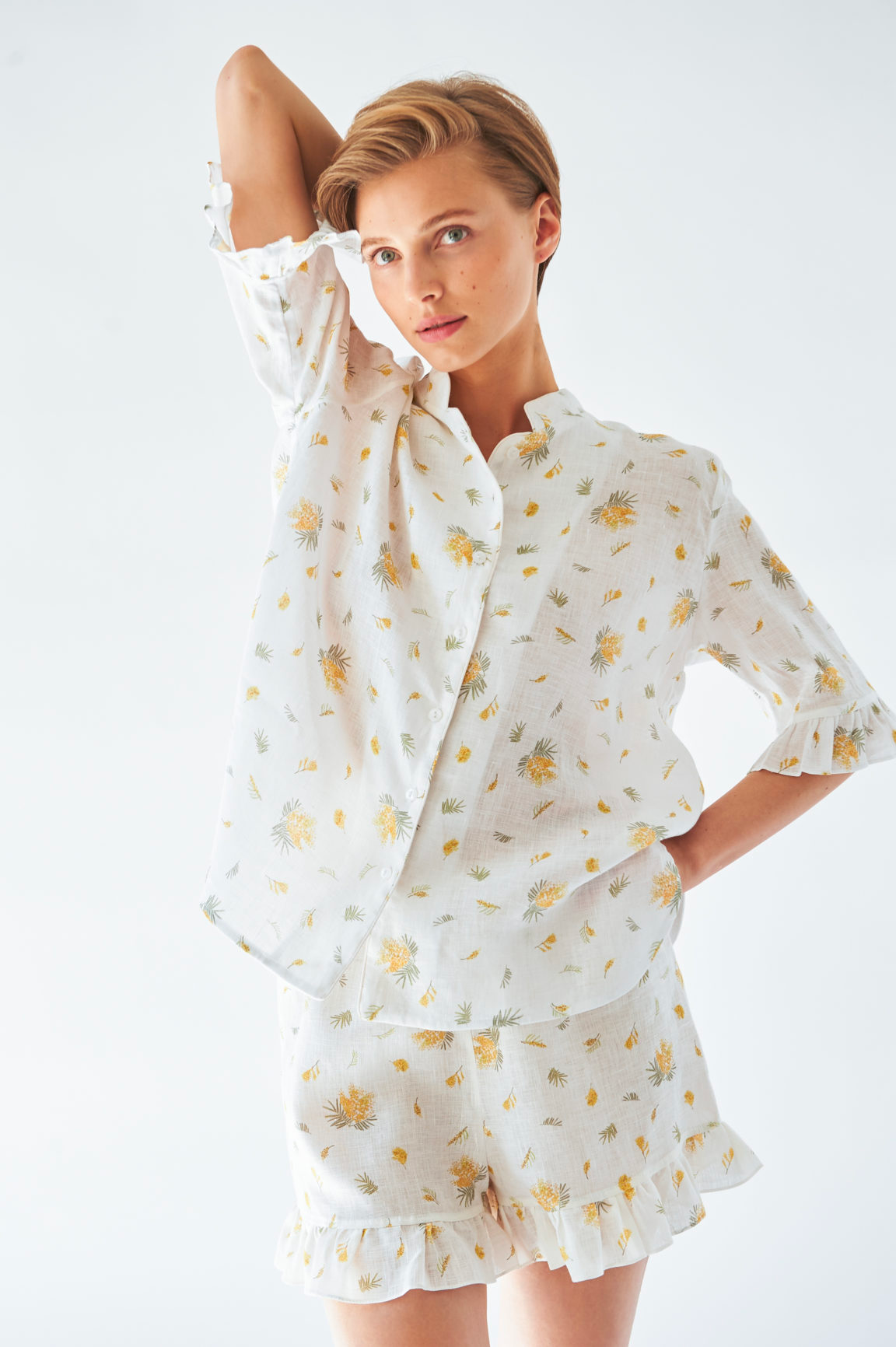 Топ и шорты с оборками задают летнее настроение образа — его поддерживает сумка ярко-зеленого цвета. Белые сандалии уравновешивают комплект за счет нейтрального дизайна.