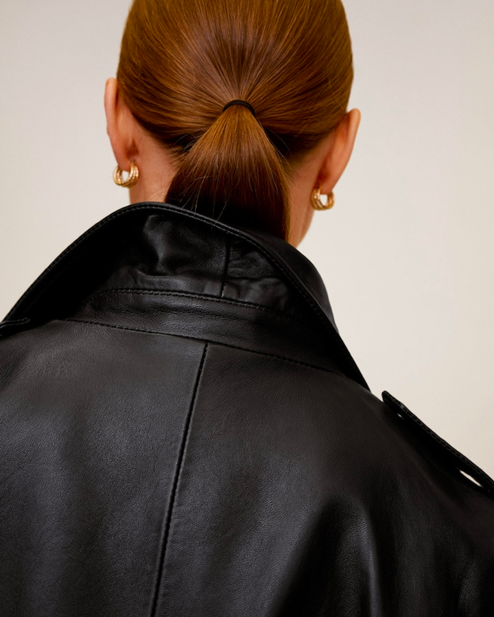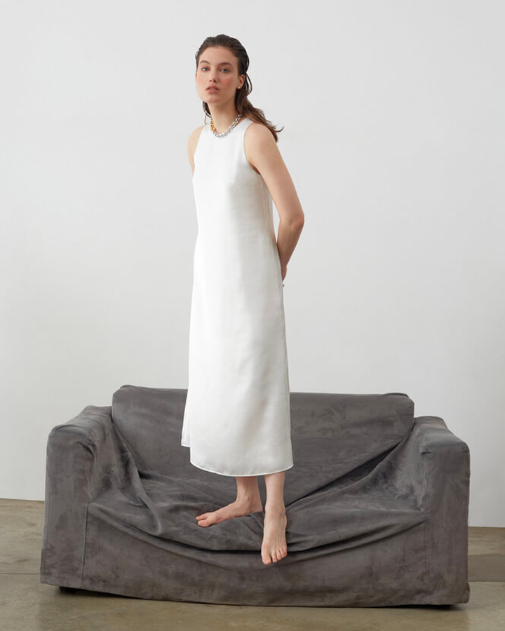 Струящиеся ткани создают легкое и женственное настроение. Платье из атласа и тренч с отлетной кокеткой дополнены сумкой из бисера и туфлями с открытой пяткой.