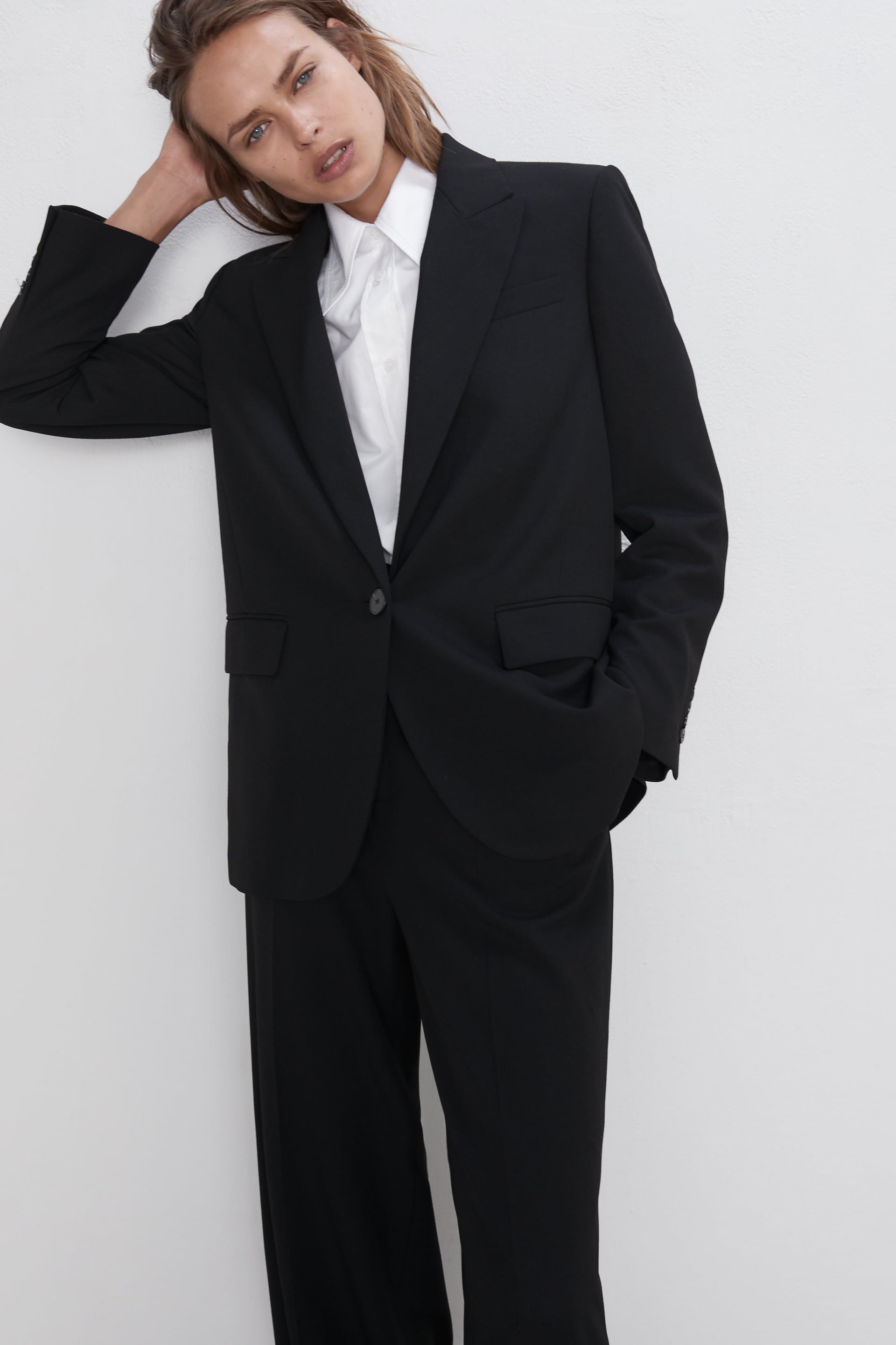 Прекрасный вариант повседневного костюма, который при желании можно адаптировать под вечерний выход. В этом образе его дополняют майка из рельефного трикотажа, актуальная сумка-мешок и туфли без задника.