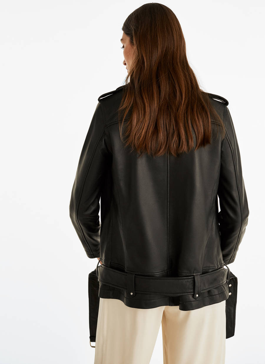 Образ строится вокруг кожаной куртки, которую нечасто можно встретить в масс-маркете. В данном образе она отлично разбавляет суперженственные вещи: мини-юбку, ботильоны и прилегающий джемпер.
