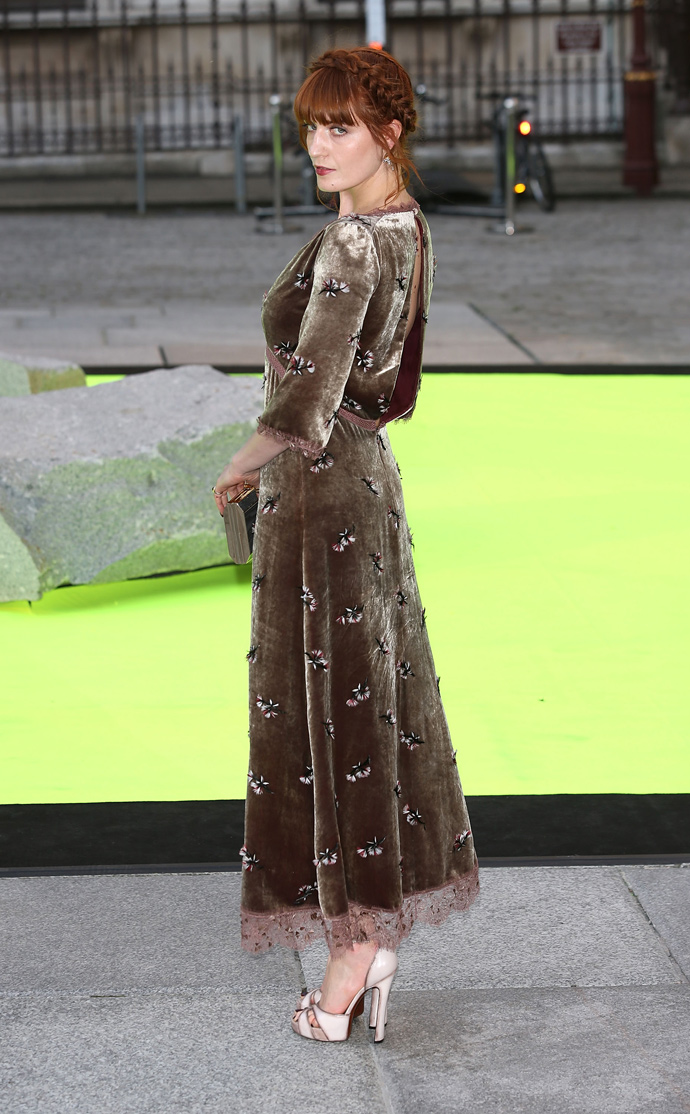 Вчера в Лондоне состоялся вечер по случаю открытия ежегодной "Летней Выставки" в Королевской академии искусств. Певица Флоренс Уэлч появилась на этом мероприятии в бархатном платье из осенне-зимней коллекции Louis Vuitton, украшенном цветочной вышивкой и кружевом. Она дополнила его босоножками Louis Vuitton из искусственно состаренной кожи и клатчем Anya Hindmarch Dutch Lady.