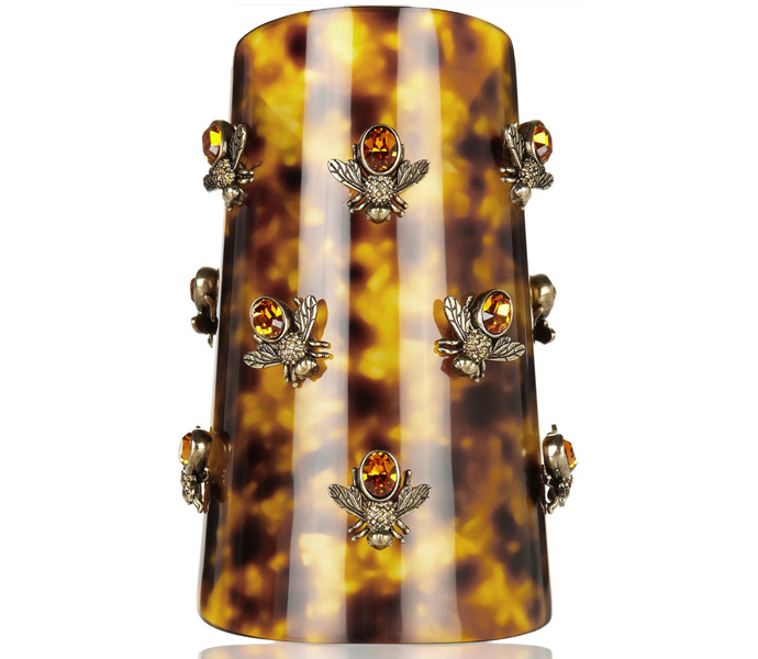 При ближайшем рассмотрении оказалось, что эти браслеты из плексигласа украшены крошечными фигурками пчел с оранжевыми кристаллами Swarovski. Концепция удалась на все 100 процентов: браслеты дополнили объемную шляпу, закрывающую глаза, жаккардовые корсеты и брючные костюмы, доставшиеся героине показа от костюма пчеловода. А фигурки пчел и правда получились как настоящие, как будто они сейчас налетят целым роем, искусают запястья и шею и запутаются в роскошных юбках-цветах.