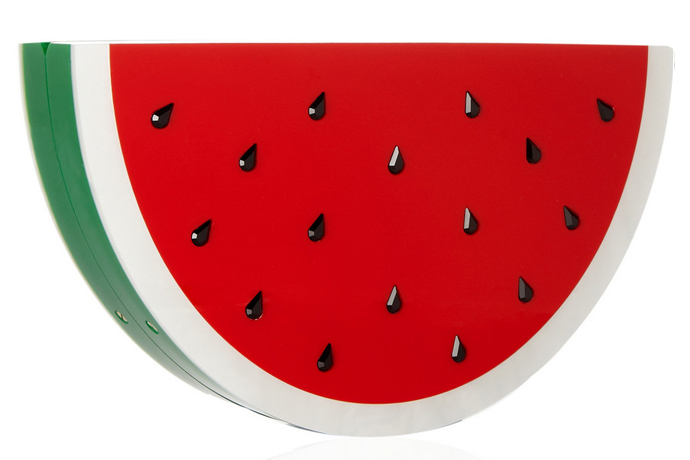 Самые вкусные в России арбузы — астраханские — поспевают в конце августа, чего мы с нетерпением ждем каждое лето. Об этом напоминает клатч Charlotte Olympia в виде дольки арбуза с зеленой корочкой, алой "мякотью" и черными косточками — кристаллами Swarovski. Он изготовлен из органического стекла — перспекса, за счет чего держит четкую форму.
