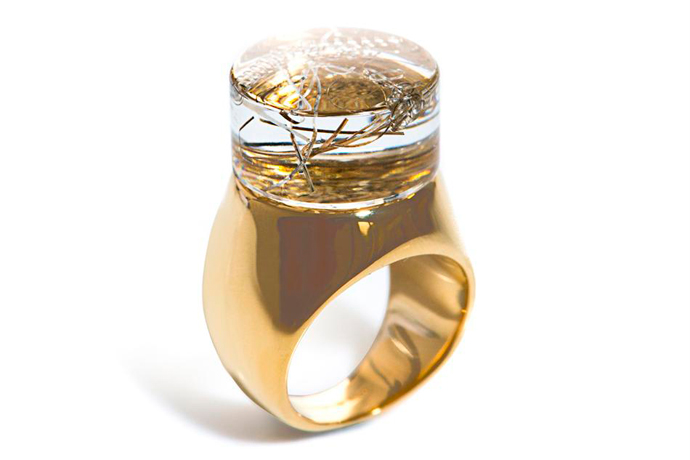 Одна из наших последних находок — металлическое кольцо Chloe в виде лампы накаливания. Его верхняя часть сделана из смолы, сквозь которую видно проводки-электроды и пружину, по-научному — "тело накаливания".