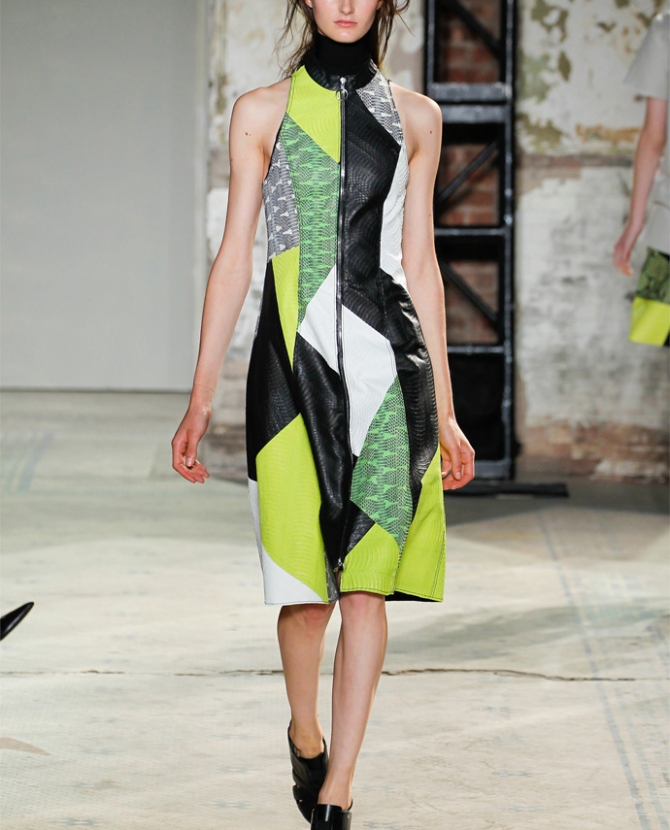 Платье из весенне-летней коллекции Proenza Schouler сделано в технике пэчворк — из разновеликих кусков разноцветной змеиной кожи, сложенных вместе в асимметричную мозаику. Цветов оно кричащих, исключительно высокой четкости: неоново-зеленого, густого черного, ослепительно-белого и стального серого.