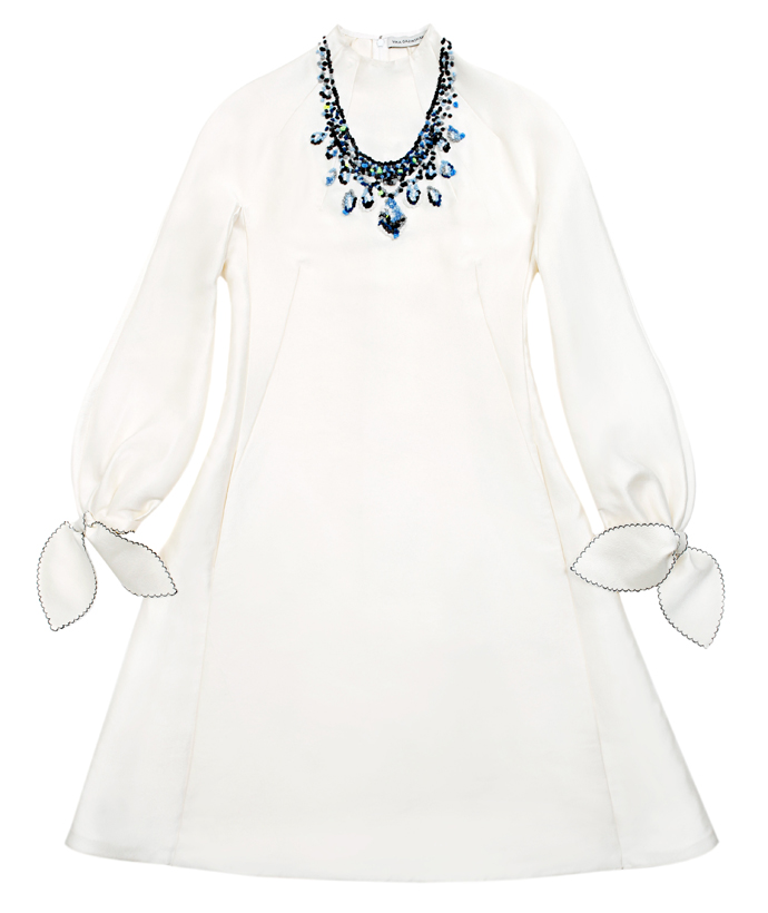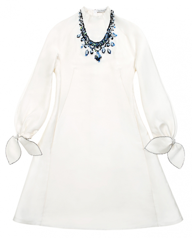Белое платье Vika Gazinskaya с узелками на запястьях и голубым колье из "драгоценных" камней мы называем "платьем Снегурочки". В русском фольклоре она появилась как персонаж народной сказки — прекрасная девочка из снега, которая вдруг ожила. Представьте, что снег смягчился и стал белой шелковой тканью, а капли талой воды — голубыми камнями ожерелья.