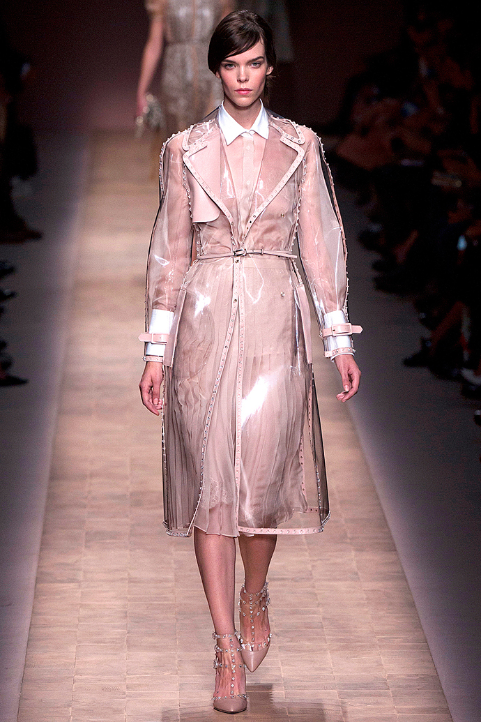 Признаемся честно: в плащ из весенне-летней коллекции Valentino мы влюблены окончательно и бесповоротно. Причин тому несколько. Во-первых, он сделан из ПВХ и потому полностью прозрачный (а значит идеальный для экспериментов со стилем). Во-вторых, он отделан каймой из кожи наппа с заклепками, по которым вещи Valentino сегодня легко узнаются. В-третьих, для теплых летних дождей ничего лучше и не придумаешь — тренч надежно защитит от ветра. А уж от такого защитника точно бы никто не отказался!