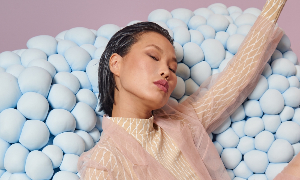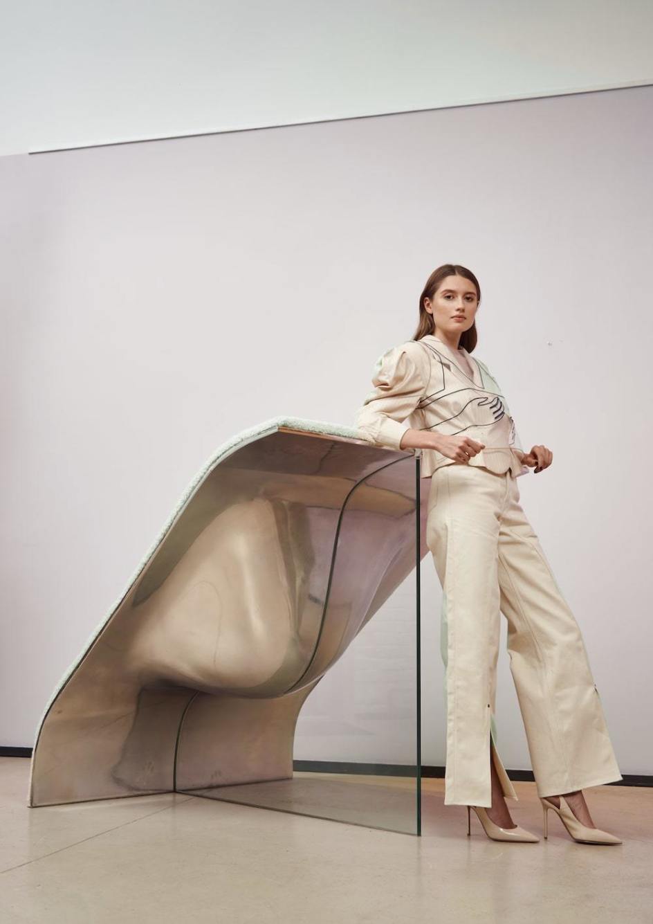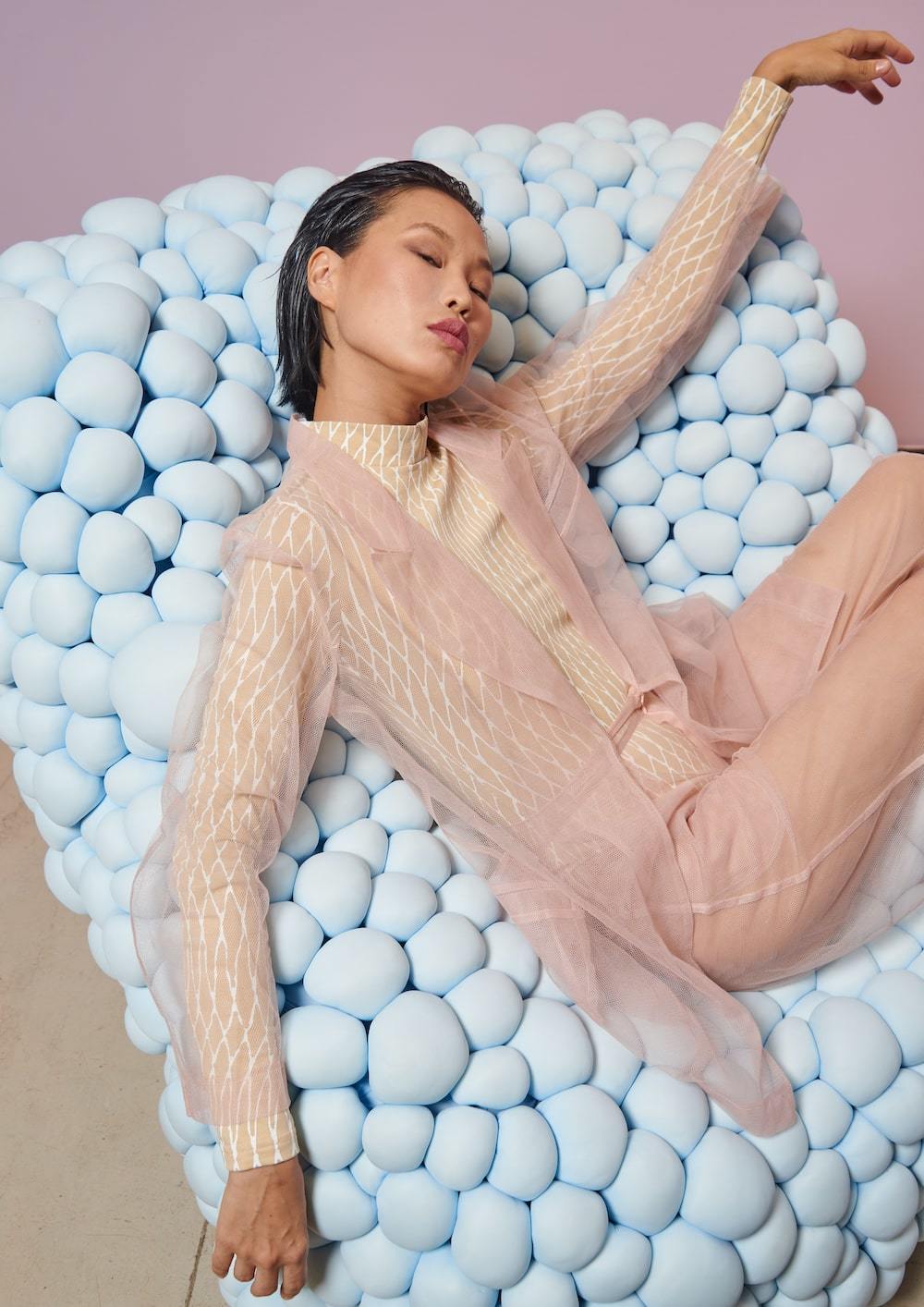 Объекты Дуни Захаровой: кресло «Облака», 2019, на стене работа из серии «Sorry I’m not a beast», 2020