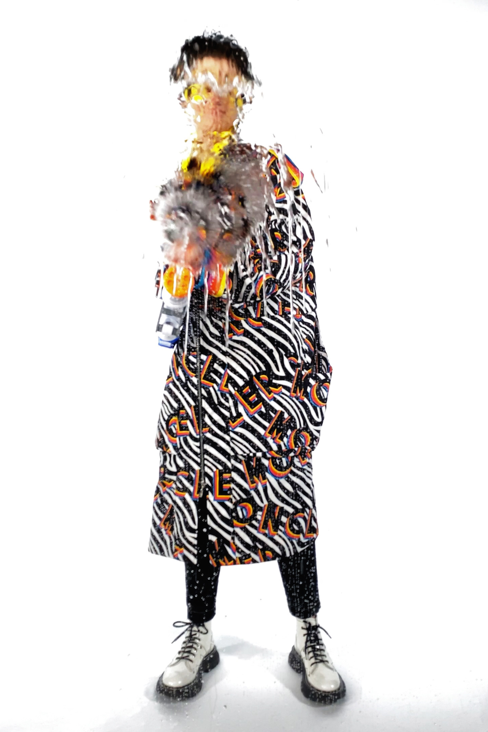 Плащ Moncler, ботинки Alexander McQueen, джинсы собственность модели
