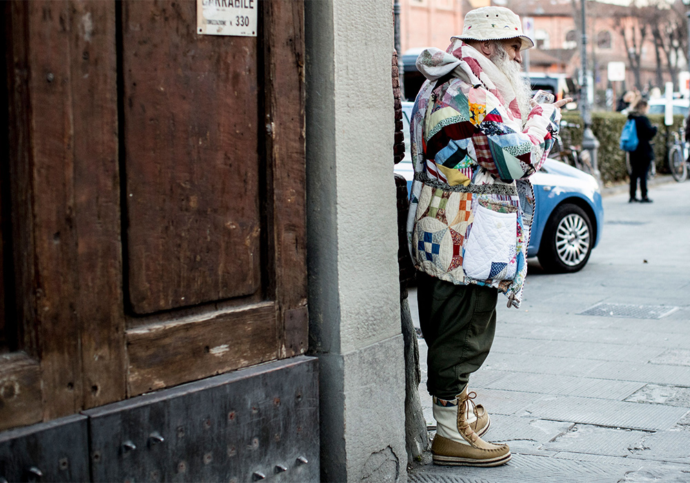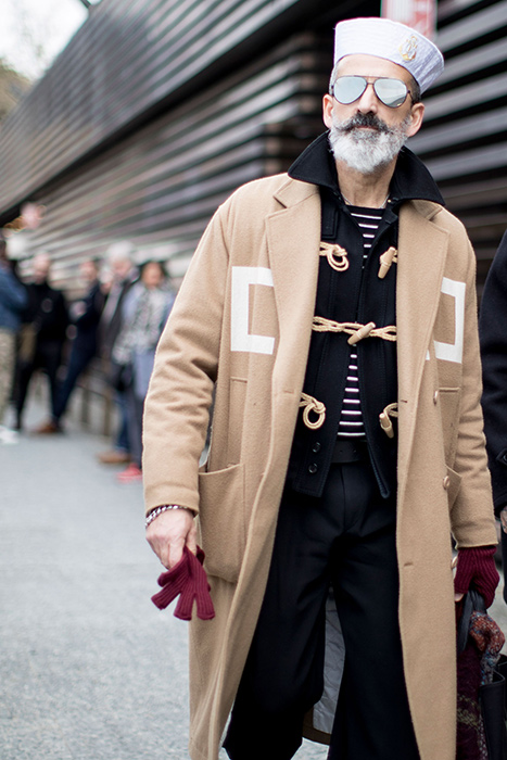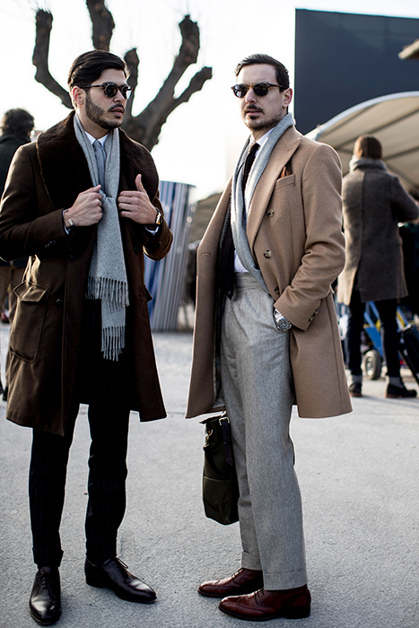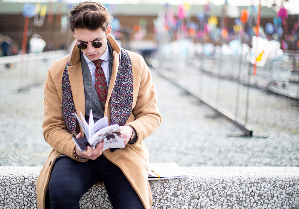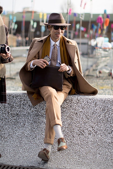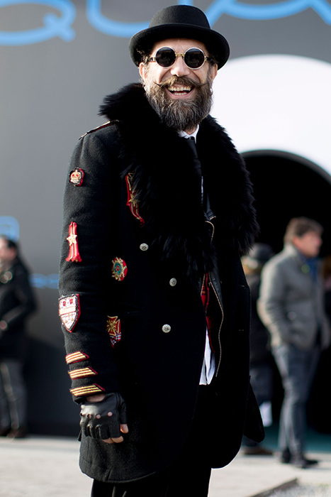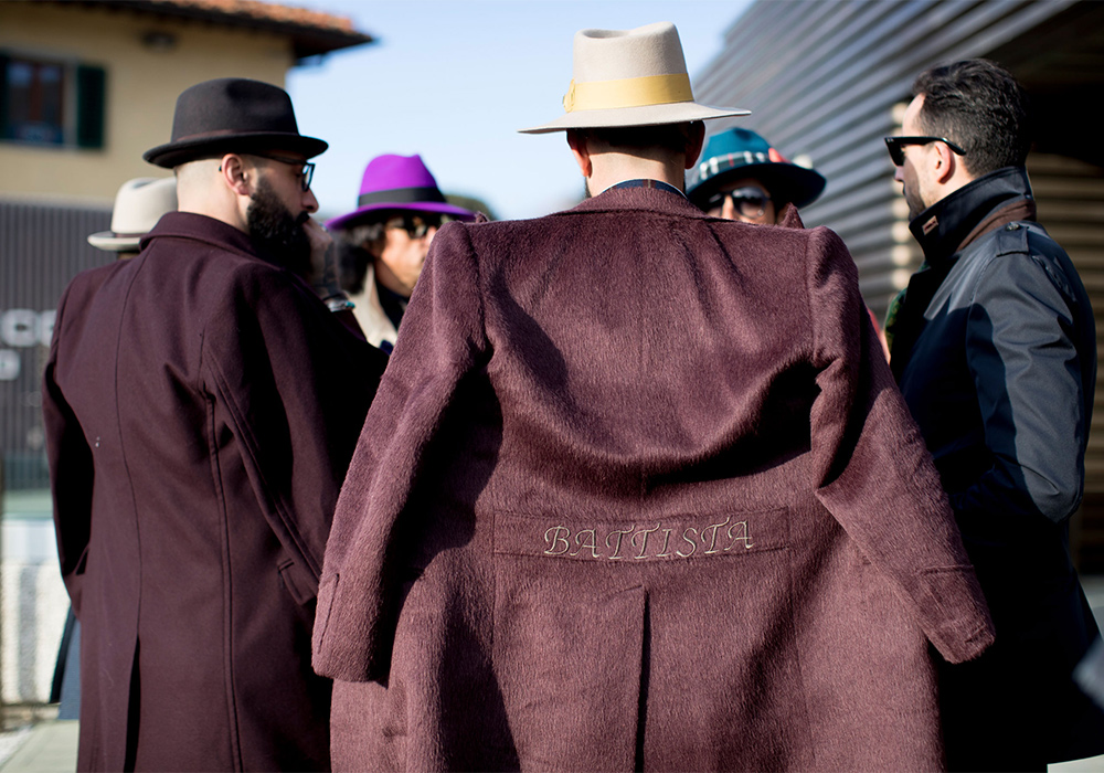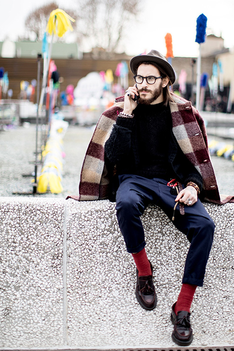 В первом выпуске стритстайла главной недели мужской моды — костюмы-тройки, классические кашемировые пальто, фетровые шляпы и кепки всех форм и мастей, яркие галстуки, бабочки и платки в нагрудных карманах пиджаков, броги с эксцентричными цветными и узорчатыми носками, а также массовое помешательство на замшевой обуви и, что неудивительно, стайлинге бород — в общем, денди во всей красе.