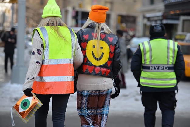 Но больше всех отличилась, конечно, девушка, выбравшая для выхода в свет творение Ашиша Гупты, неоновый жилет Ashish в пайетках — в спутники ей идеально подошел бы один из полицейских, стоящих вокруг. Большая удача, что рядом не было дорожных рабочих.