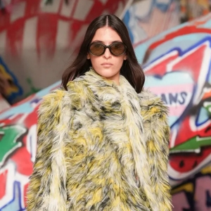 Лепестками этой же розы Дэвис засыпал подиум и отдал должное черному и красному в коллекции. Увидели здесь широкоплечие пальто, отлично уживающиеся с трикотажными лосинами и джемперами в тон; костюмы-тройки оверсайз и кожаные тренчи в горьком шоколаде. Дэвис расшил алые платья перьями и мастерски превратил кожаный фартук в сложносочиненную юбку. Он перенес тропические принты на органзу и показал сразу несколько гибридных вещей (платья с палантином на плечах и шерстяные пальто-кейпы). Он использовал мех сольно и в качестве набедренных вставок на полупрозрачных платьях. Он акцентировал внимание на it-bag Hug, переместив ее на талию и карманы на кожаных бомберах.