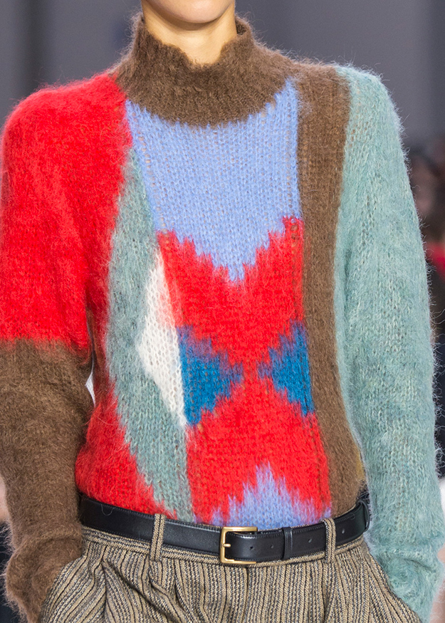 Основные элементы: мини-платья, пальто и шубы, шерстяные джемперы и оверсайз-кардиганы, блузки с бантами, жабо или воротничками
