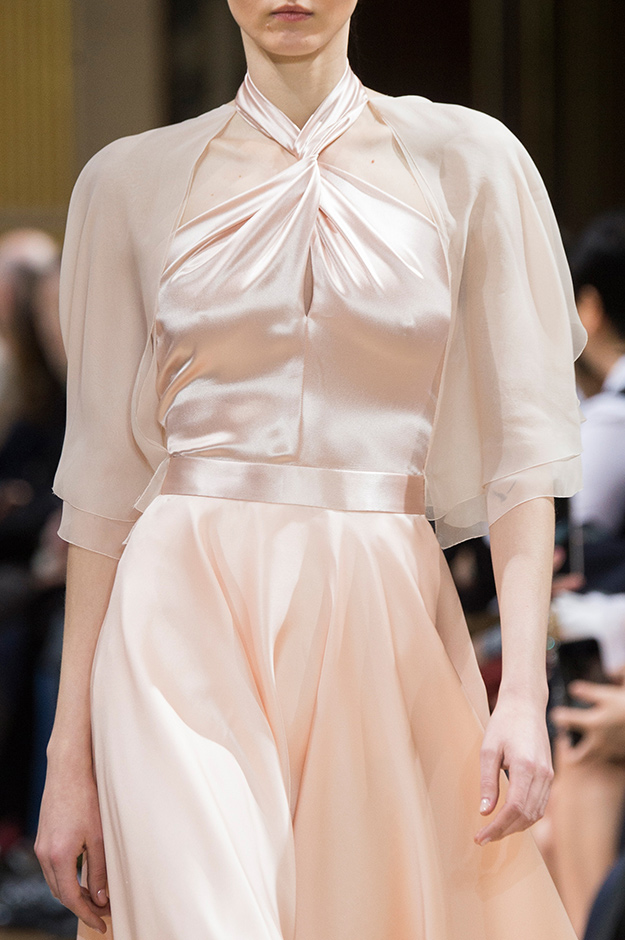 Новая коллекция, представленная на Неделе моды в Париже, построена на контрастах — классики и провокации, светлого и темного. Летящие фасоны и простой крой дизайнер соединила с громоздкими рюшами, кожаными элементами и пышным мехом, а сдержанные образы в белом, черном и нежно-персиковом цветах дополнила сетчатыми колготками, косухами и грубыми ботинками. При этом все вариации сочетаний, созданных Жаррар, остаются в рамках понятия о том, что такое женственность.