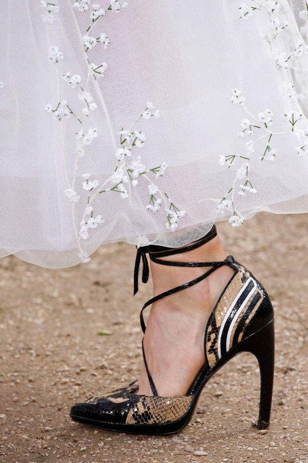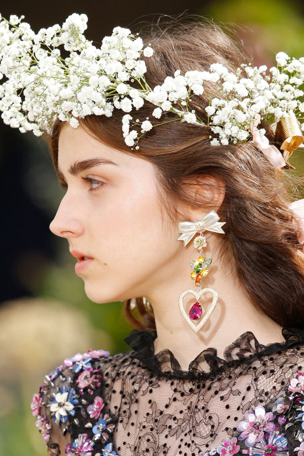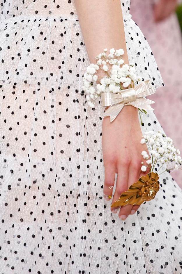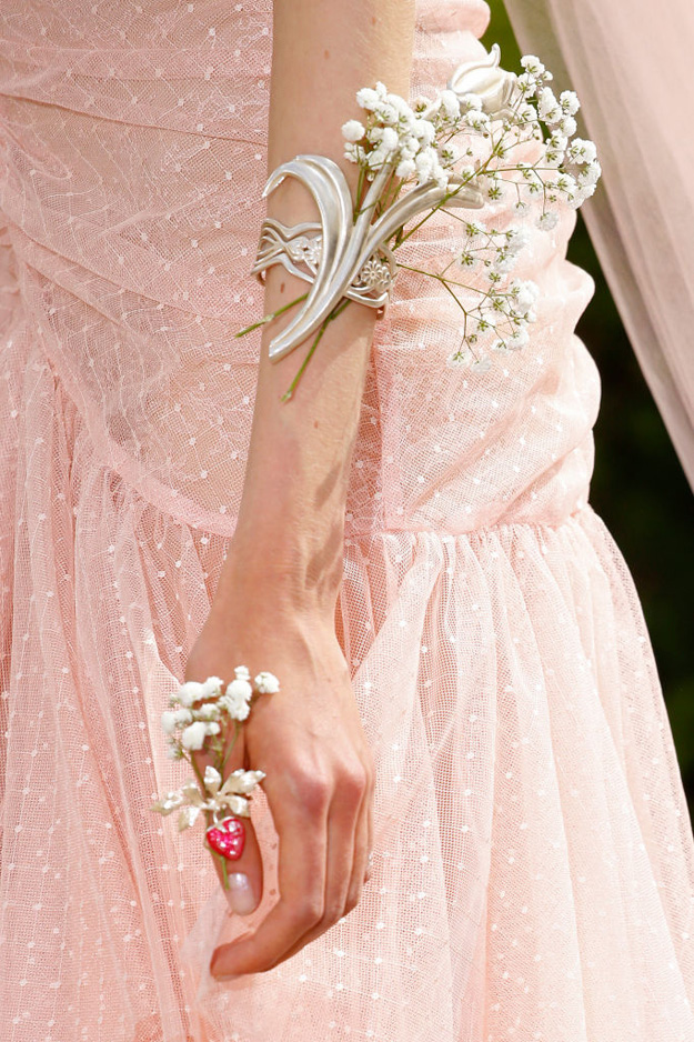 Показ новой коллекции прошел в саду при старинном особняке XVI века. Выбор локации — сада, полного цветущих роз, как будто из фильма Софии Копполы, — полностью соответствует настроению самой коллекции: волосы, руки моделей и платья были украшены распустившимися цветами, а шифоновые, шелковые и полупрозрачные тюлевые наряды повторяли оттенки английских роз.