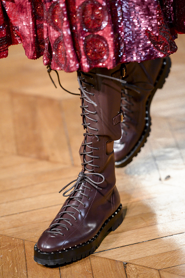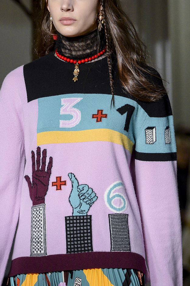 В осенне-зимней коллекции Пьерпаоло Пиччоли пошел куда дальше классических римских мотивов и связал две непохожие эстетики: викторианские мотивы и авангардную эстетику миланской дизайн-группы «Мемфис». С одной стороны, в коллекции присутствовали величественные аскетичные силуэты, с другой — неожиданные сочетания неоновых цветов, мультяшных принтов и аппликаций.