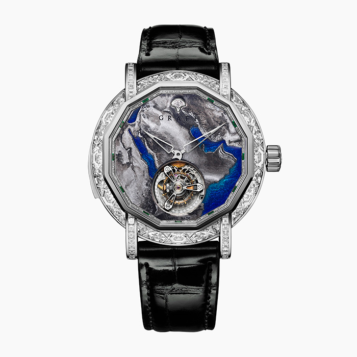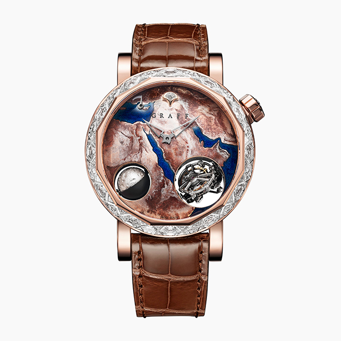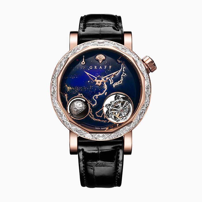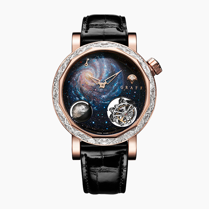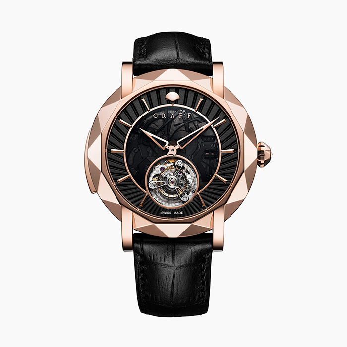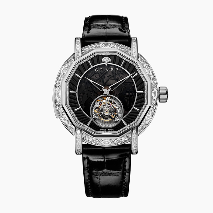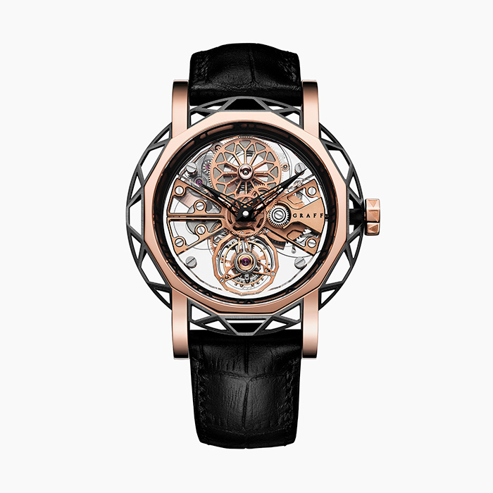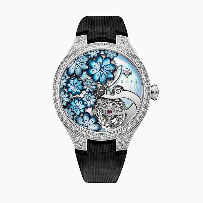 Главной новинкой от ювелиров из Graff стала модель MasterGraff Floral Tourbillon, ее циферблат усыпан узорами из белого золота, декор выполнялся вручную.